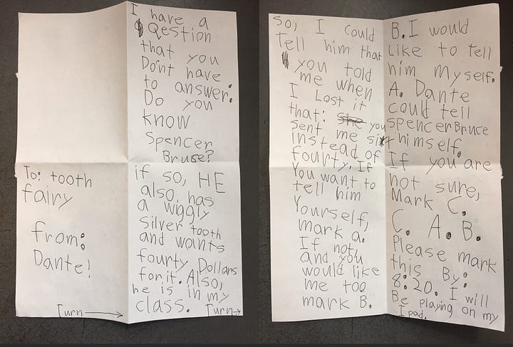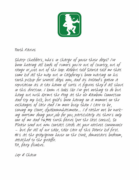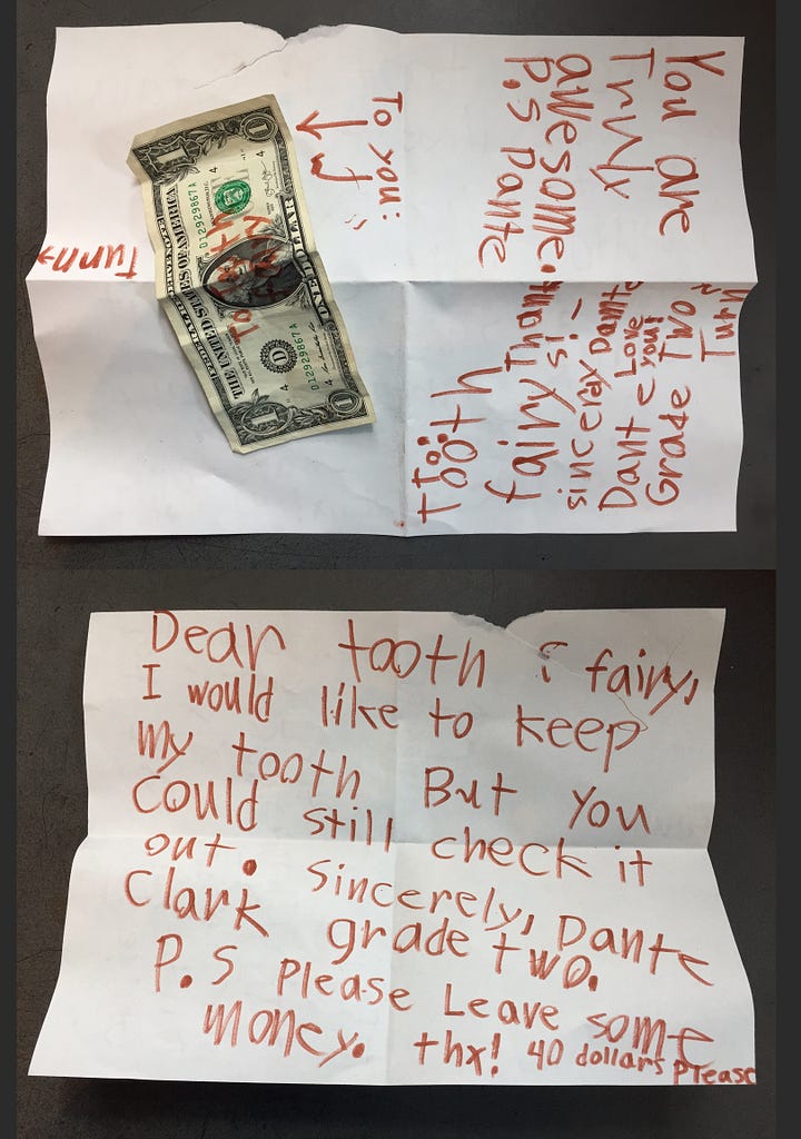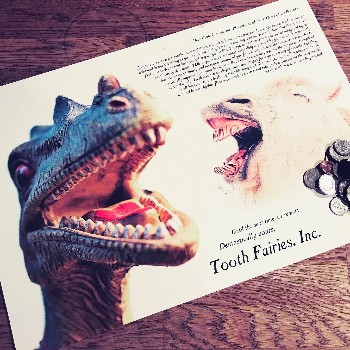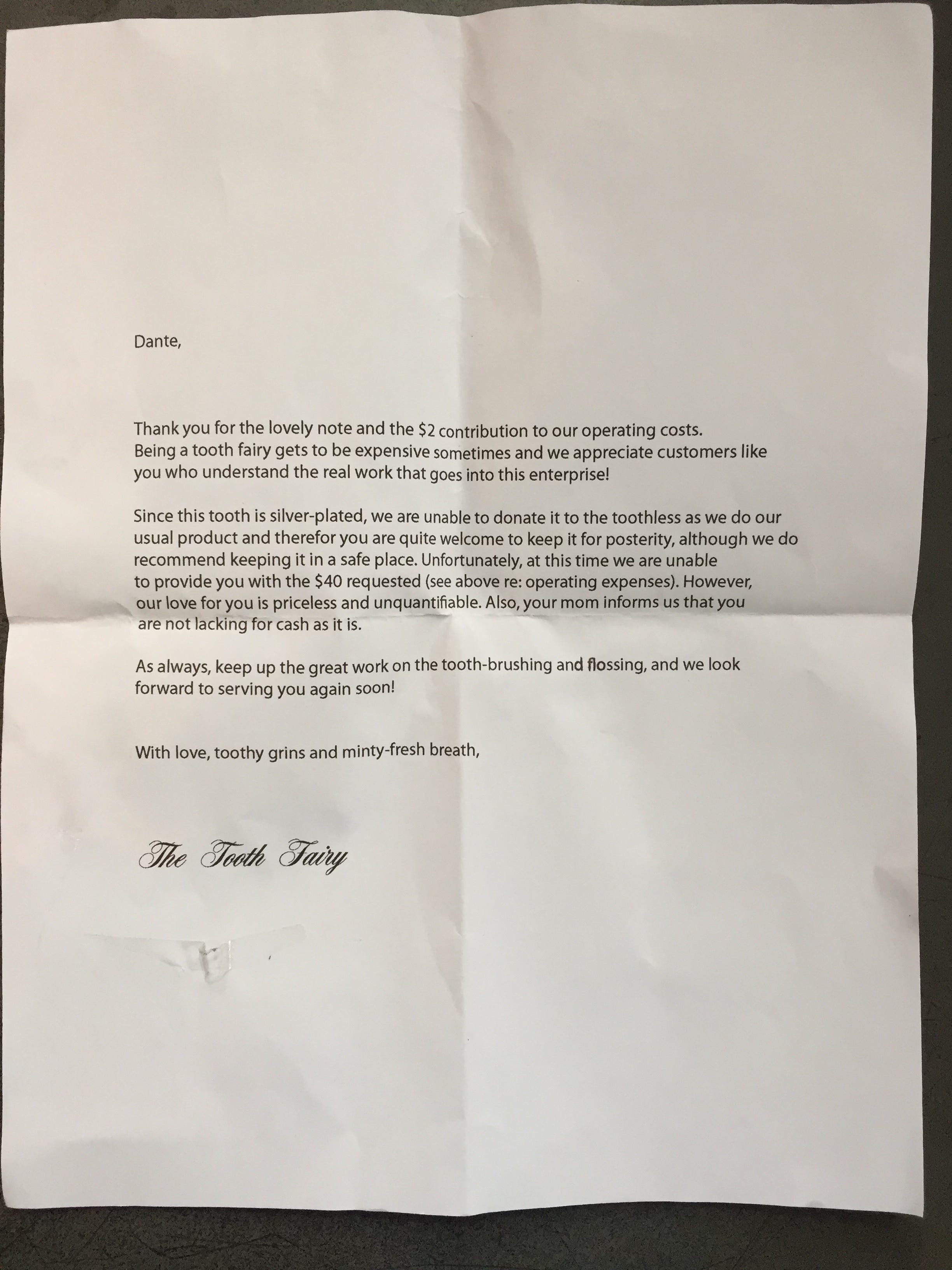 Apparently the father-branch of Dante’s personal fairies had been paying out exorbitant sums for fallen teeth, which may be one reason they rarely came out on my watch. Once Aaron quit (all duties, not just the fun ones) and I became sole proprietor of Dante’s remaining childhood fantasies I decided to have some fun with it.