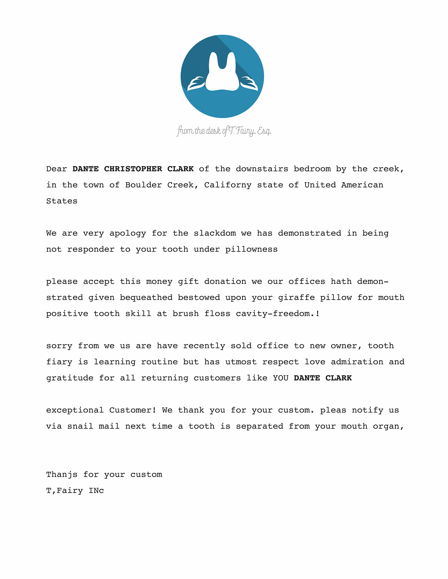Not comics, exactly… but inspired by my morning’s trials I’m sharing with you the archived correspondence between a certain young boy and the worldwide bureaucracy of Tooth Fairies Inc.