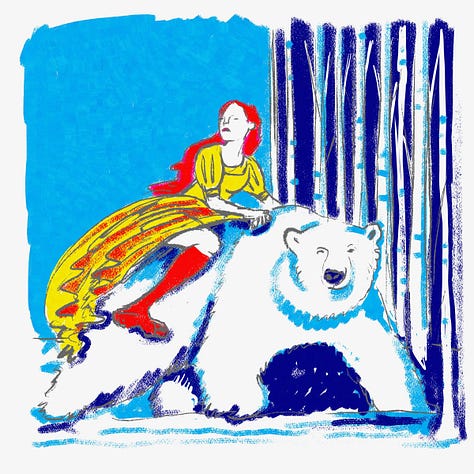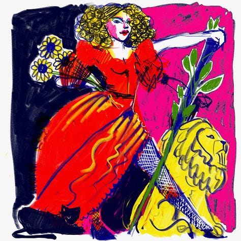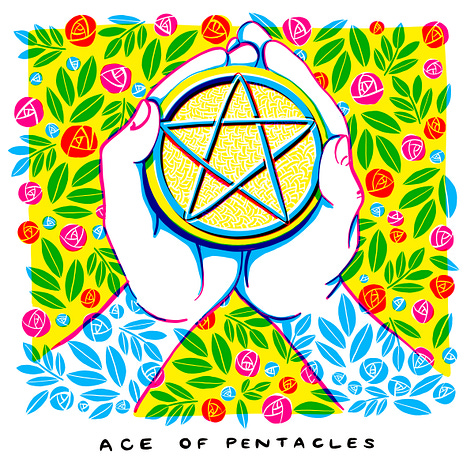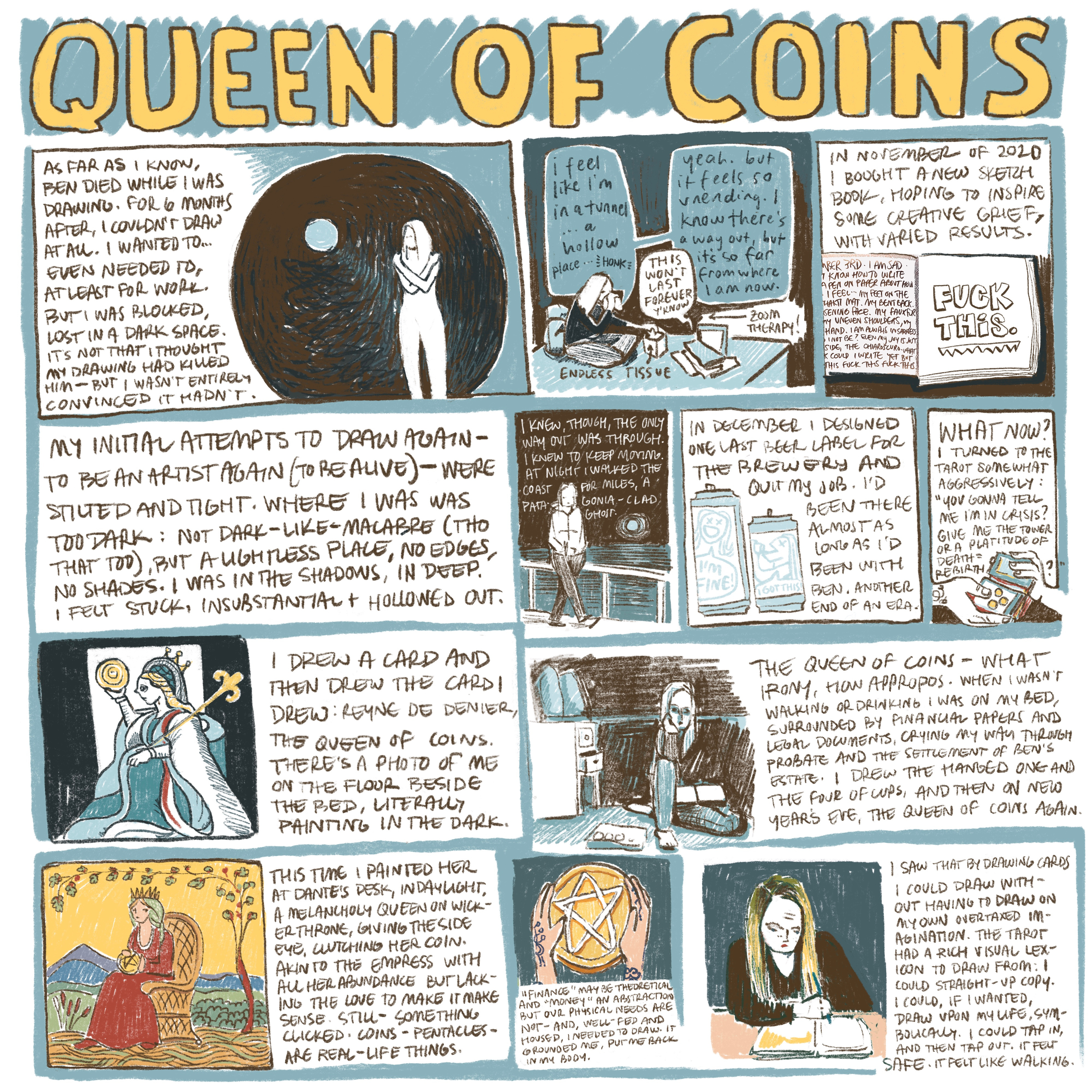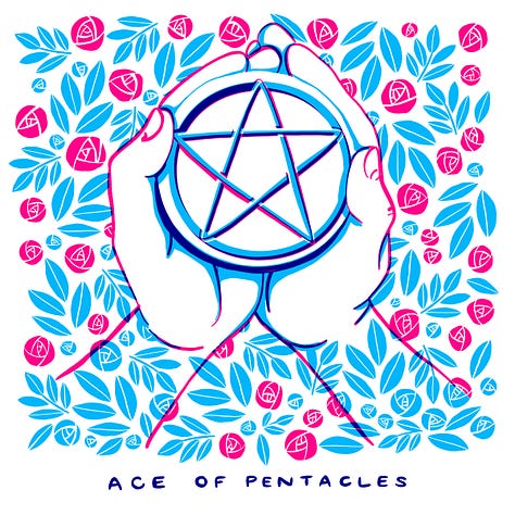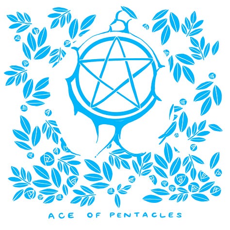 This is not one of those “and then the world became bright again” kinda stories — it took (has taken? is taking?) a long time, thousands of miles walked and many more boxes of tissue — I wore only black for a year and a half — not in a public display of mourning but because color was one less thing to consider. I drew the Ace of Cups (that font of awe, that vessel of unbridled delight) deep in a Dry January numb, counting down til I’d let myself drink again. But choosing the cards randomly (rather than starting with the Fool, or an Ace, and working them in sequence) felt (feels) like performing an ongoing, in-depth reading for myself and has allowed all kinds of synchronous connections and insights to arise. Some cards I've balked at (both the Three and the Ten of Swords were completed within a day as I didn’t want to stay under their influence — while the Tower took weeks + a retreat + the death of our dear cat Bobo to reckon with), but all have come at the “right time” — because it is in our interrogation of the cards and their symbols that meaning is made.