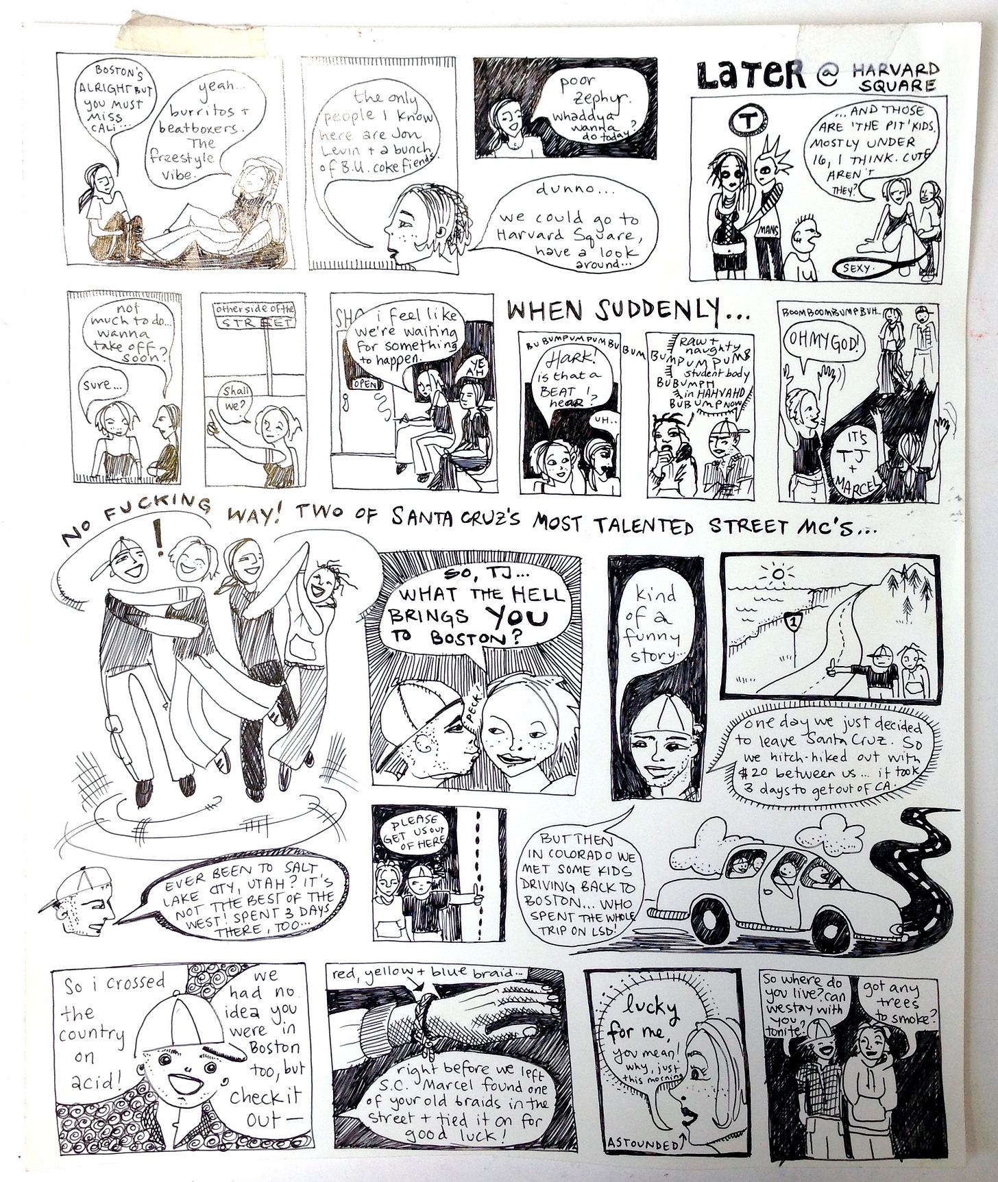 & as promised: TJ, making his entrance along with Marcel in panel 9 and Harvard Square. Devo (panel 1) was visiting from Santa Cruz and the arrival of the Raw N Naughty Student Body changed everything about Boston and, as is the way of things, my entire life. I would not now be in Bisbee if we all hadn’t miraculously convened in Cambridge that day. What an incredible world we inhabit!!