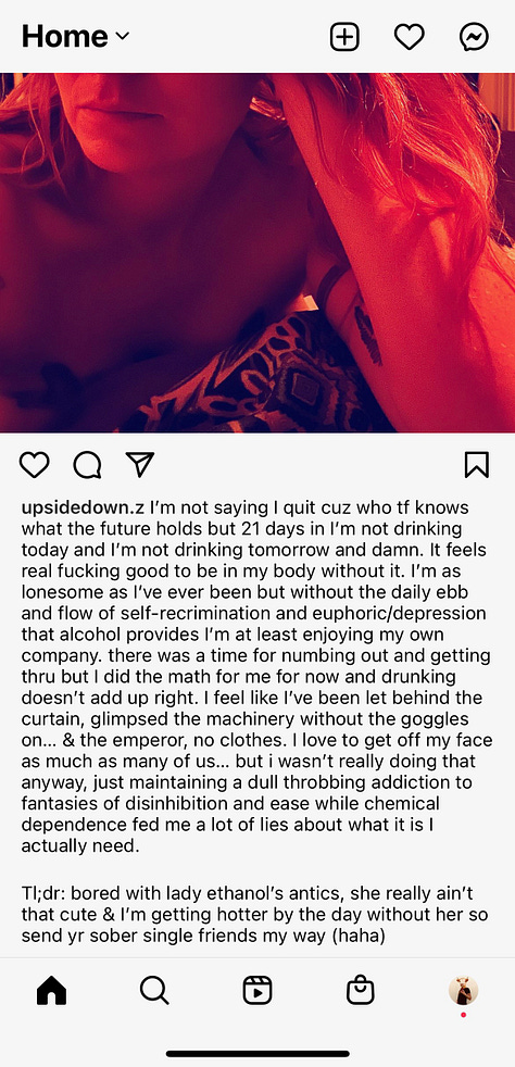 1 — I was truly ready to quit. Since Ben died and especially since moving to Portland (with the exception of a Dry January and a half-assed half-Sober October) I drank nearly every day — out of habit, in addiction, in an attempt to numb my grief. And increasingly, at the end of the evening or the mornings after — because I would never let myself fully attain the oblivion I sought, single and devoted mother that I am — I would feel every ick I was trying to avoid, ten times over and soaked in shame. I had a lot of clarity about what I was doing to myself and how my behavior was out of alignment with my true values. When I decided I was done it was because I knew there was nothing left in it for me to gain but everything to lose. 2 — Paradoxically, I didn’t start out determined to give it up forever. I began with another dry January and reckoned that I would decide at the end of the month if I wanted to keep going. I knew I wanted to want to, so I did everything I could in January to set myself up for a Booze-Wary February (this is terrible, will hopefully come up with something better before publishing) 3 — This included listening to lots of sobriety podcasts and aforementioned Quit Lit on Audible, which did two very important things: 4 — gave me a scientific understanding of alcohol use and alcohol dependency, simultaneously affirming my desire to stop poisoning my body and providing me with a roadmap for what I could expect during the chemical recalibration phase and 5 — let me know that there was a very large and inspiring community of people who had made the shift to sobriety and had utterly no regrets (for a quick fix, google sober celebrities) 6 — I went to a few AA meetings, which — while ultimately not my personal route to sobriety — were an essential support at times when I felt I was the only sober person in Portland (or NYC, where I left Trevor at a bar to go to a 10:30pm meeting in the West Village and bought a teeshirt to prove it and to maybe one day signal to someone rad that I too have been to the coolest AA mtg in North America) 7 — I used an app that I had seen my dear friend Callie post a screenshot of — Callie was a year sober and an inspiration, along with our friend Patrick, both friends from Santa Cruz High with whom I had shared (& often instigated) the experience of many adolescent shenanigans and, later, the loss of Chris, who had been the 4th wheel of our late-90s clown car (and who, not incidentally, died in 2007 as a result of another man’s drunken decisions — alcohol was a factor in at least three of the four deaths that have most shaped my life, none which had anything to do with long-term physical illness). The app showed me how many days of sobriety I had as well as how much money I’d saved by not drinking, and had a forum wherein I could read other people’s experiences and the outpouring of support that invariably followed. 8 — I paid deep attention to my body, to how it felt without alcohol, to what felt better and what, initially, felt worse. Thanks to the Quit Lit Library I knew there was a rough timeframe wherein I could expect withdrawal symptoms in the form of heightened anxiety, disturbed sleep patterns, erratic energy, increased moodiness and so on… and also that such discomfort would pass as my body adjusted to its new normal. I also basked in the absence of any hangover whatsoever as well as the overall better health, wellbeing and body delight that has continued to this day… what I had thought was feeling good was still so far from my current baseline. As someone smart once said, “if it wasn’t worth it I would’ve started drinking again.” 9 — I spent much of those early days dealing with the sensation of constant over-stimulation (one thing that your body does in response to habitual alcohol use is increase the release of stimulating hormones — cortisol, adrenaline etc — in an attempt to homeostasize the depressant effects of alcohol — when you quit suddenly it takes the brain awhile to catch up — hence the shakes and even heart attacks that long-time, deep-in-it drinkers may experience and why the medical establishment recommends consulting a doctor before going cold turkey) by exploring Portland on foot or by bike — one day I left the house for coffee in the morning and ended up eight miles away at the top of Council Crest. I also cried a lot and let myself cry: if one reason I had been drinking was to numb my sadness and rage over the death of Ben (and Aaron and Chris and Kelsey), I knew that to quit meant to embrace the fullness of the feelings that I had been avoiding. In doing so I entered some very, very dark places within myself — and in doing SO, I came through. 10 — it helped immensely that I was in a new city living a new life, that I was financially solvent, that I didn’t have to work full time or be in buzzy situations if I didn’t want to. I had the support of family and friends, some of whom were also on their own dry journeys. I had time and space to grieve, to yell and cry and walk and draw and moan. I had conviction that I wanted out of alcohol’s influence and those times when I wanted to waver I sheltered in stubbornness and a dumb refusal to quit quitting. In other words, I had everything going for me and still it was hard. It is hard to change one’s patterns and habits and proclivities. Our culture is a drinking culture. But women, friends, citizens, my fellow Americans: this is my conspiracy theory: they want us to drink because animals who are busy chasing carrots on sticks will not have the energy to direct their righteous rage and creative force for change beyond the carrot to the master who holds it out of reach.