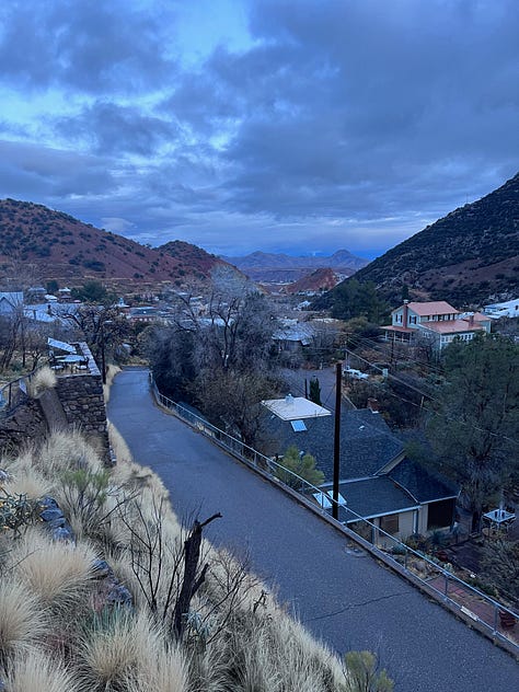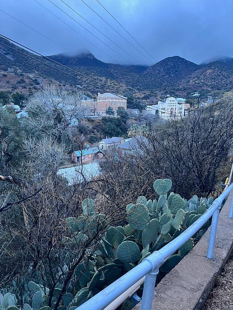 My walk this morning was the Bisbee 1000 Stair Climb, which (though solo and uncompetitively completed) was a great 1.4 hour, 4.3 mile workout during which my heart thumped between 93 and 175 beats per minute. Then I took an