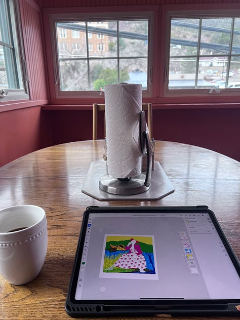What’s left: the Empress, the Hanged One, the Queen of Swords, the King of Wands, the King of Pentacles, the Eight of Swords, the Six of Cups, the Ace of Swords. I’m working on the Empress now, based on a drawing I did in 2019 when I first started thinking about making a silkscreened tarot deck. I